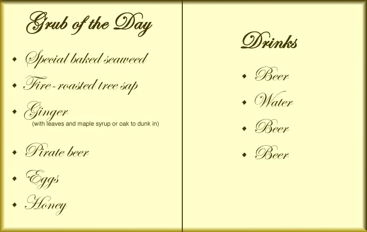 Thatıs the menu... I decided to have some ginger and a nice cup of water on the side. I waited for about a minute and my meal was ready. A pirate named Jake served me and told me he was the captain! He asked me if I knew anybody by the name of Robert FitzRoy, I nodded my head and he winked and let me enjoy my meal.