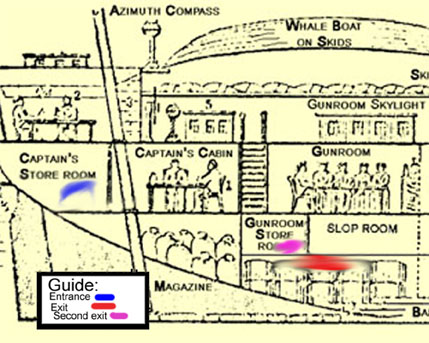 Now I had something to work with—there was a bit of rope sticking though a invisible portal, and as I pulled it, it tore the fabric of the wormhole, revealing that it went through the ceiling and into the gunroom, where it dissappered into midair. I separated some of the rope fibers and pulled apart the portal. (See the figure below)
